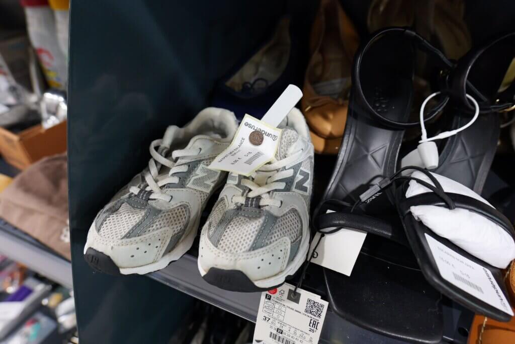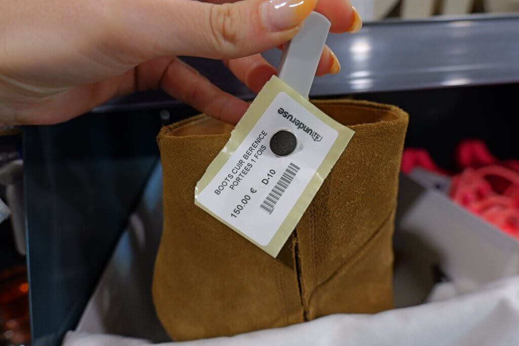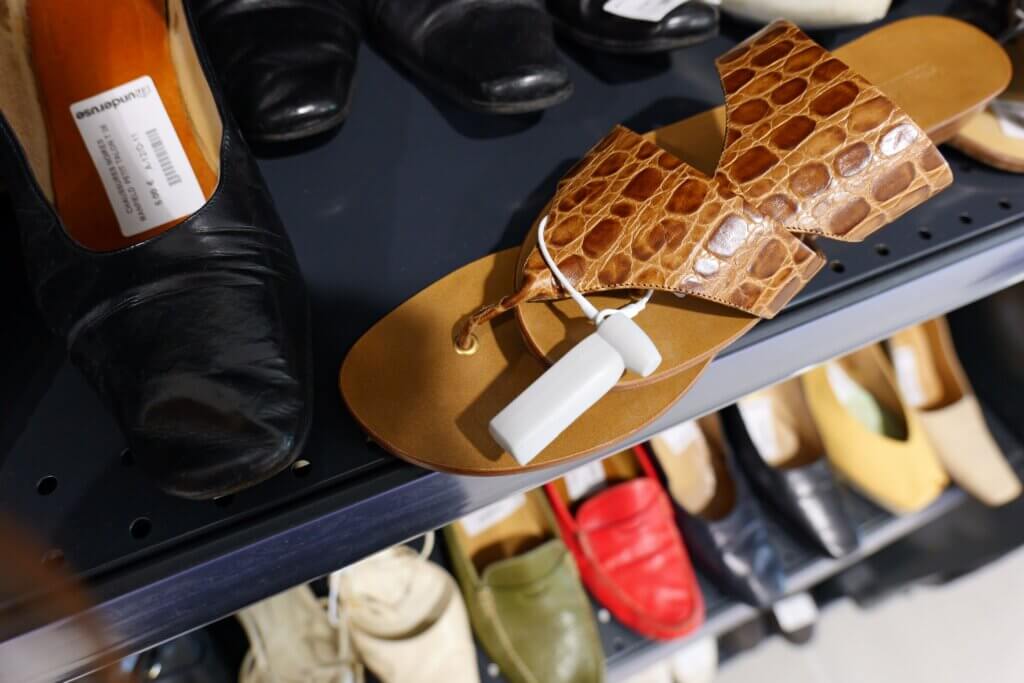 Les paires de chaussures peuvent être sécurisées avec nos lanières ou bien des antivols classiques.