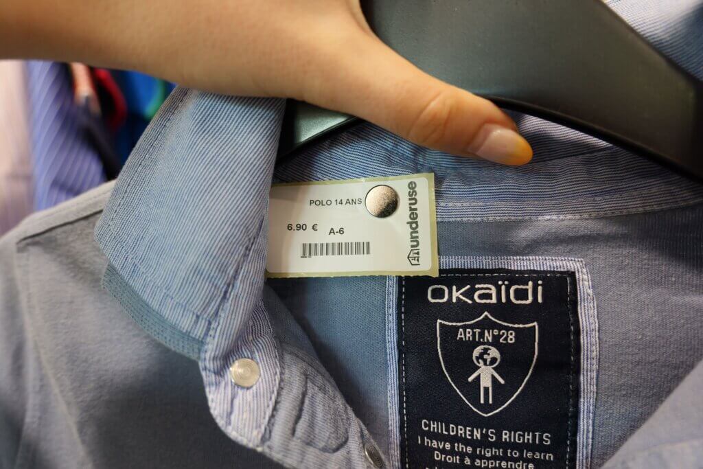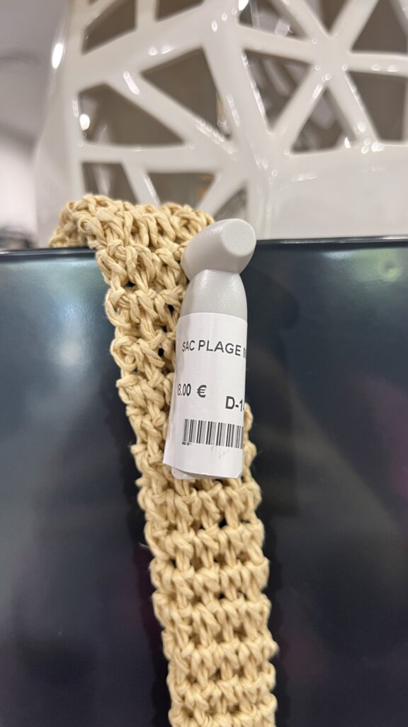 Poinçonne l’étiquette avec l’antivol (surtout pas sur le code-barre !). Pas d’étiquettes sur les cintres et antivols.